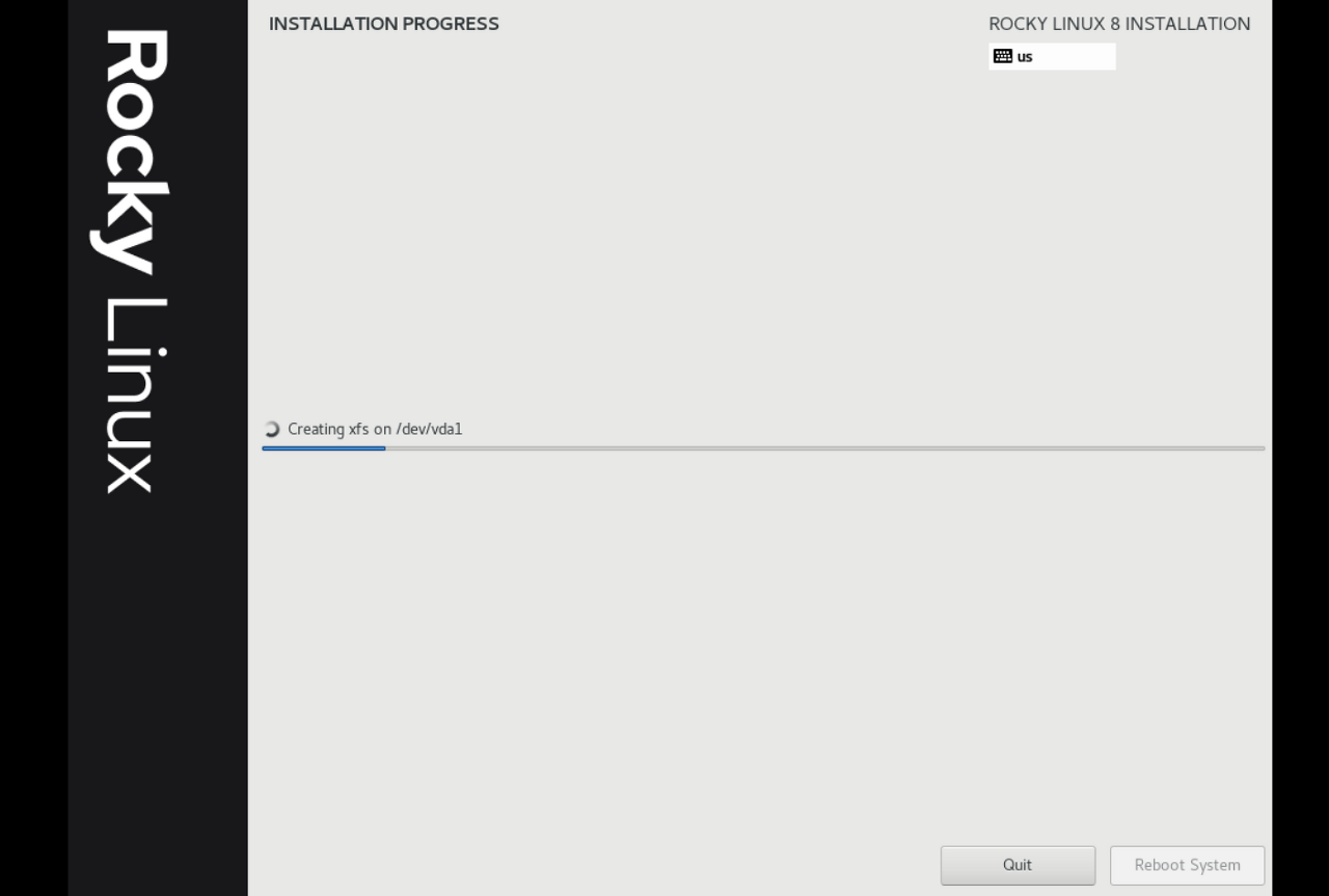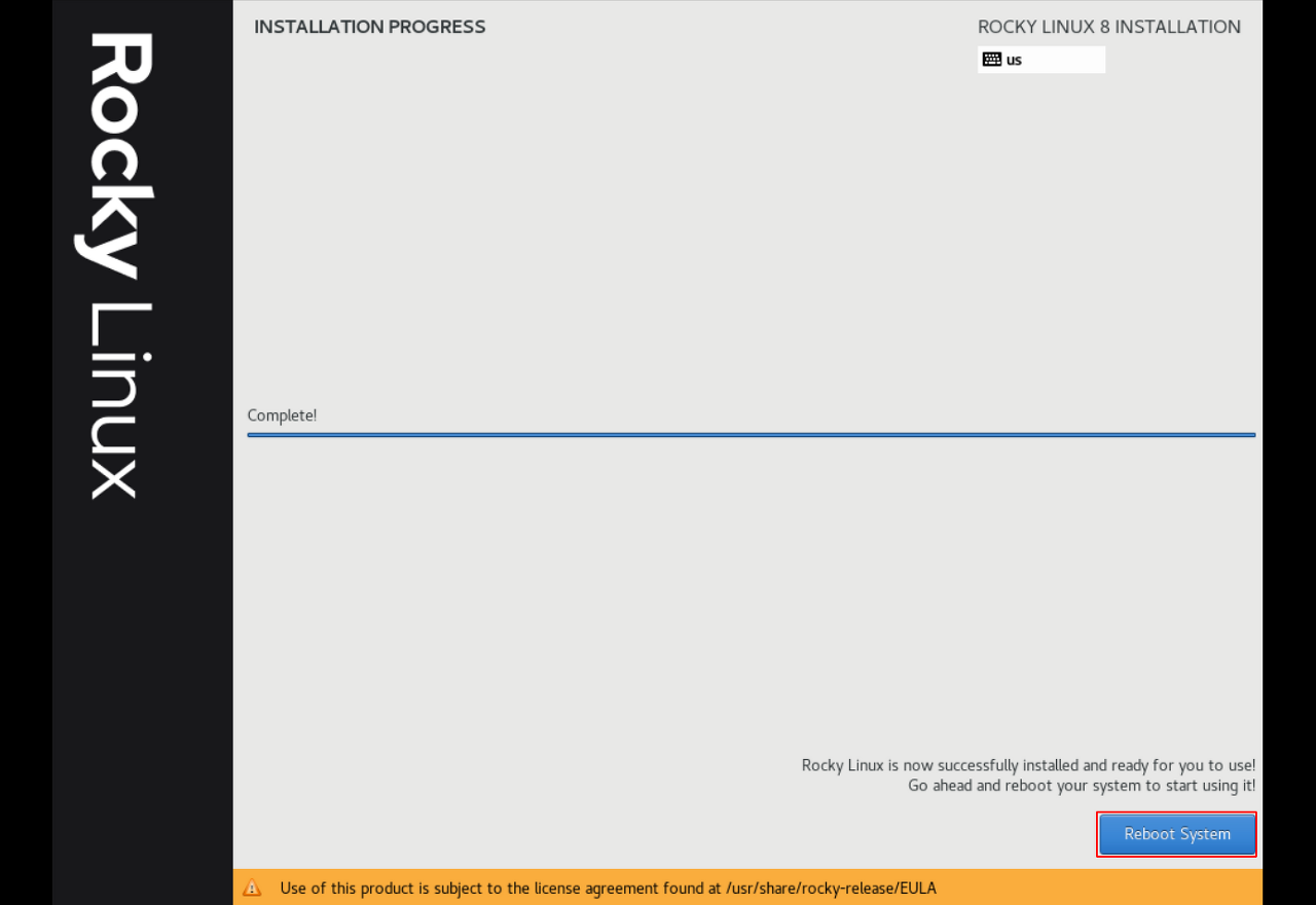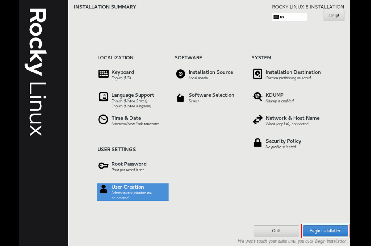 1. 각 단계에 대한 설치 구성을 다시 확인하십시오. 그런 다음 "설치 시작" 버튼을 클릭하여 Rocky Linux 설치를 시작합니다.