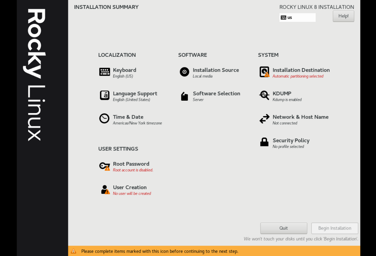 다음 창에서 Rocky Linux \설치 요약\ 페이지를 볼 수 있습니다. Rocky Linux 설치를 위한 네 가지 단계를 완료하라는 메시지가 표시됩니다.