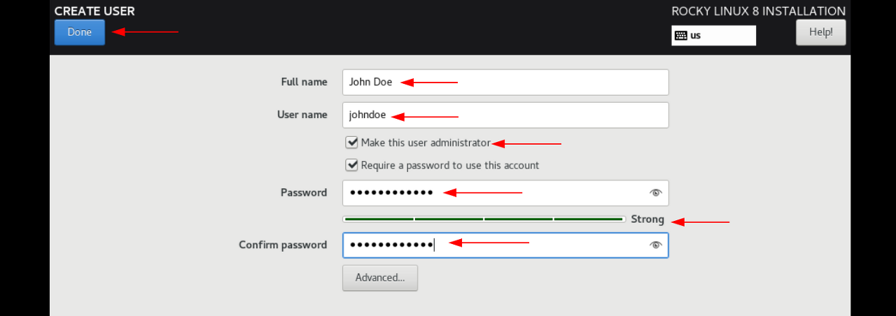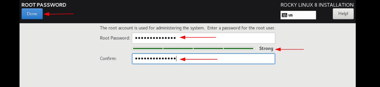 이제 강력한 루트 암호를 입력하고 반복한 다음 "완료" 버튼을 클릭하십시오.