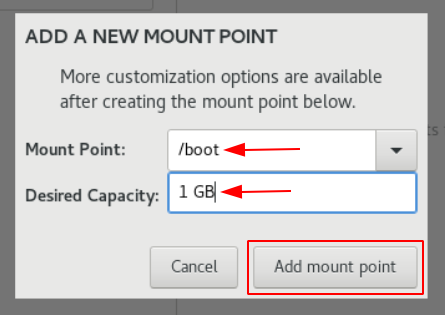 부팅 파티션: 마운트 지점: /boot - 원하는 용량: 1GB