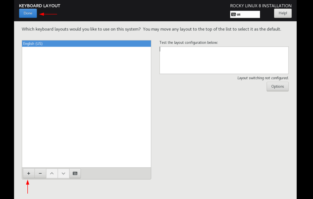기본 키보드 레이아웃 구성은 \영어(US)\입니다. 새 키보드 레이아웃을 기본 키보드로 추가하려면 "+" 버튼을 클릭한 다음 "완료"를 클릭하여 설치를 계속하십시오.