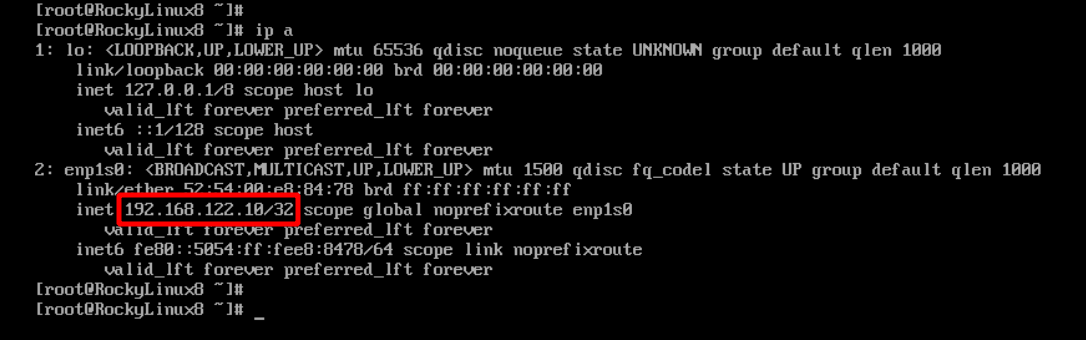스크린샷에서 볼 수 있듯이 Rocky Linux 서버는 IP 주소 \192.168.122.10\을 받습니다. 이 서버 IP 주소를 사용하여 서버에 연결하게 됩니다.