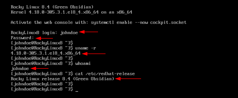 2. 이제 다음 명령을 실행하여 Rocky Linux 버전, 커널 버전 및 현재 사용자 로그인을 확인합니다.