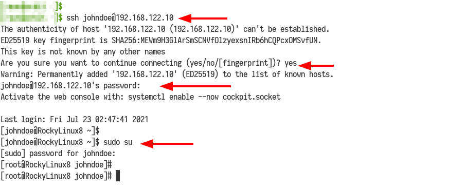 3. 다음으로 아래와 같이 ssh 명령을 사용하여 다른 머신에서 Rocky Linux 서버 IP 주소에 액세스합니다.