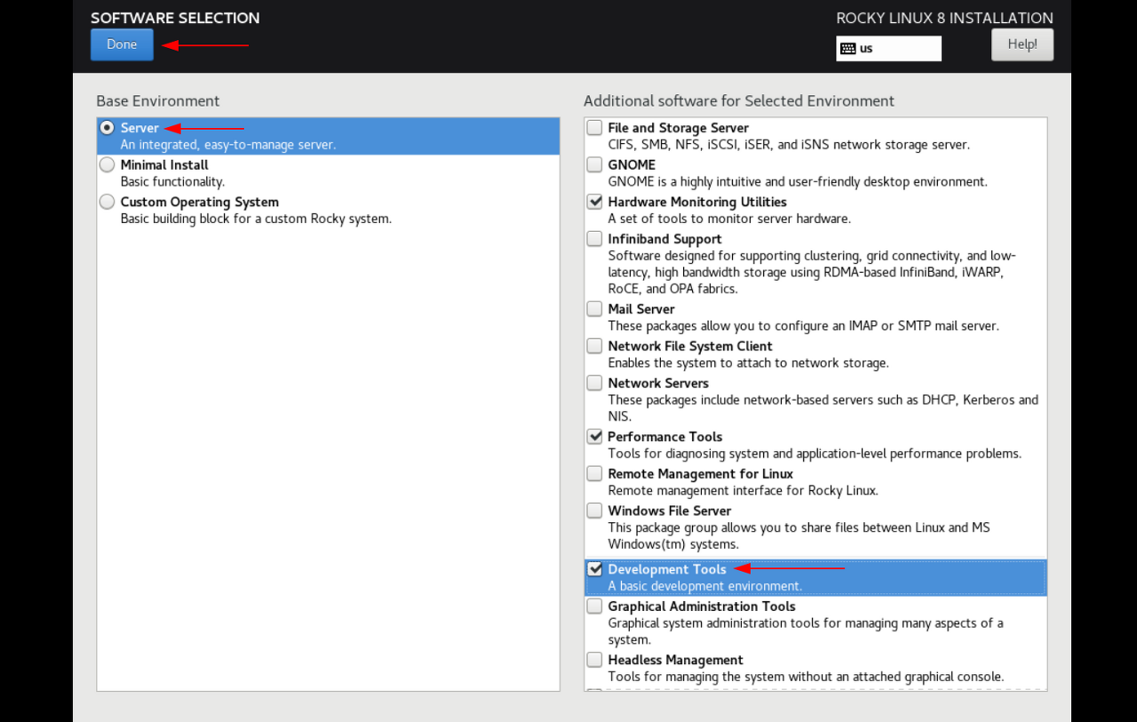 Rocky Linux를 서버 시스템으로 사용하려면 "기본 환경" 섹션에서 "서버" 옵션을 선택하십시오.