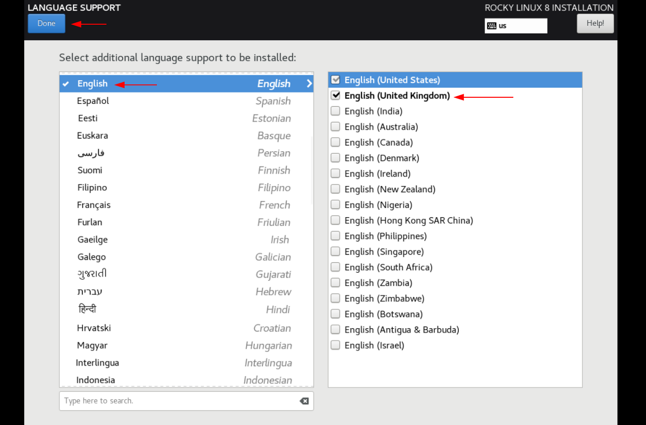 1. Rocky Linux 시작 페이지에서 원하는 설치 언어를 선택하고 "계속"을 클릭합니다.