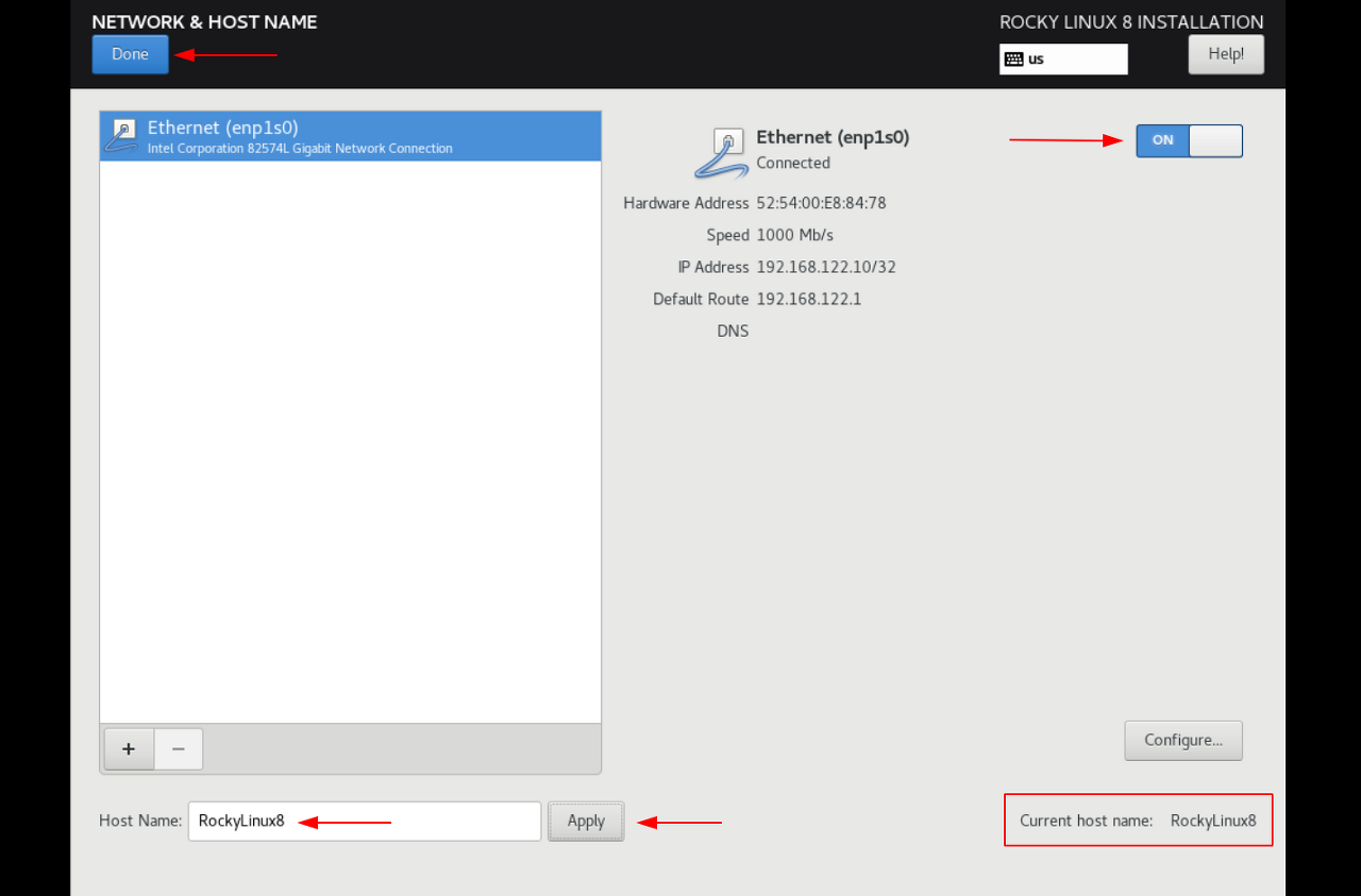 그런 다음 "Host Name" 상자에 Rocky Linux 시스템의 새 이름을 입력하고 "Apply"를 클릭합니다.