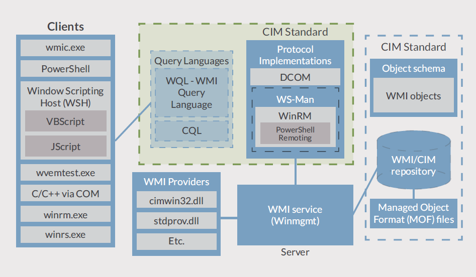 WMI는 WBEM(Web-Based Enterprise Management)와 CIM(Common Information Model) 표준을 마이크로소프트에서 구현한 것이다.