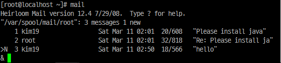 도착한 메일이 없다면. No mail for (본인 계정명)이 뜰 것이고, 있으면 목록이 뜬다.