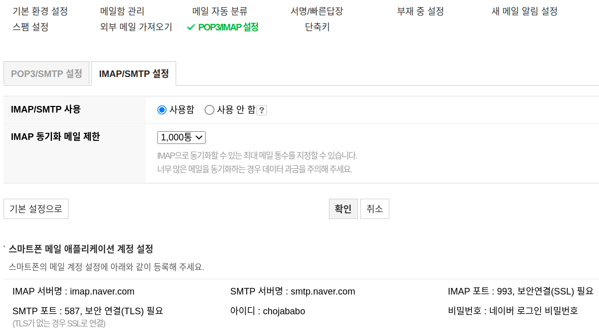 상단의 'POP3/IMAP' 설정 선택 -> IMAP/SMTP 설정 탭 이동 -> IMAP/SMTP 사용을 '사용함'체크 후 확인
