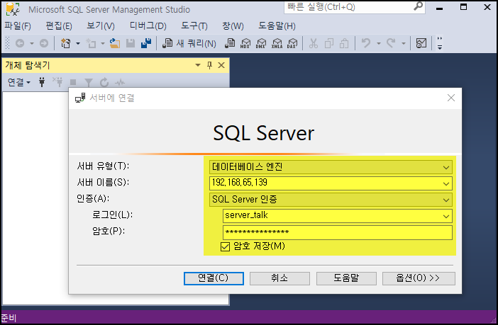 마지막으로 SSMS를 통한 외부에서 접속이 가능한지 테스트 해보겠습니다