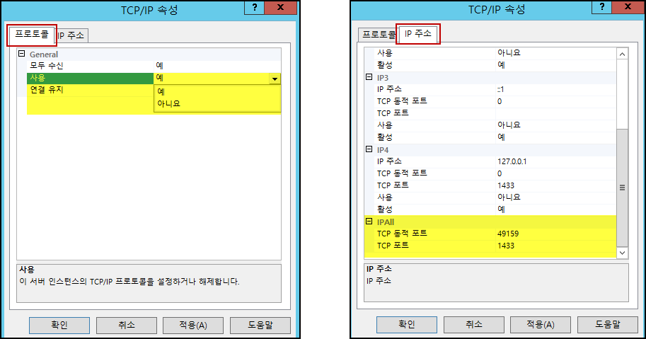 TCP/IP 속성으로 들어가시면 프로토콜 사용 IPALL 에서 포트 1433으로 지정합니다
