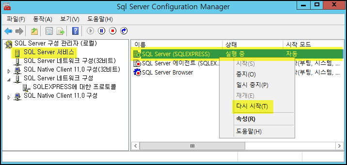 변경된 정보를 반영하기 위해 SQL Server 서비스 -> 우측의 SQL Server (SQLEXPRESS) [우클릭]하여 다시시작 하시면 됩니다