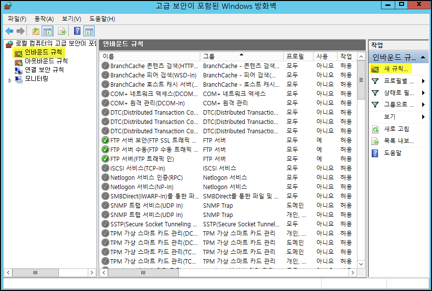 고급 보안 포함된 Windows 방화벽 에서 좌측 [인바운드 규칙] - 우측 [새 규칙] 을 선택합니다