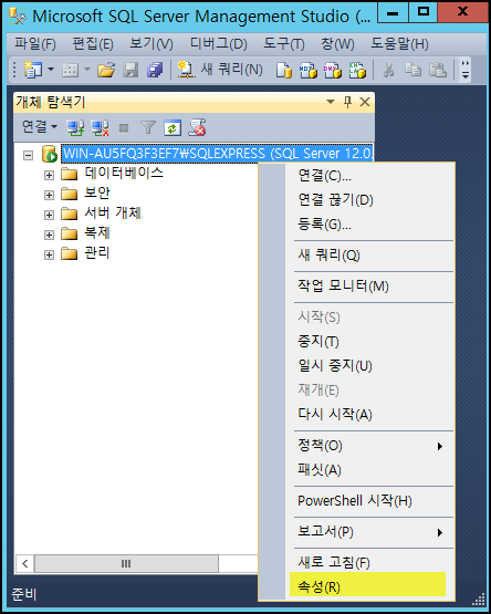 SQL Server Managemet로 들어간후 SQL Server 속성으로 들어갑니다