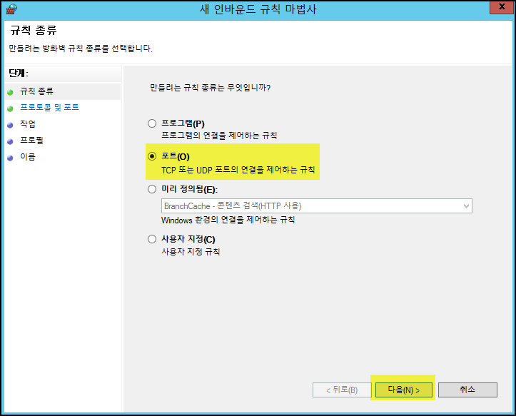 규칙 종류에서 포트를 체크 후 다음으로 진행합니다