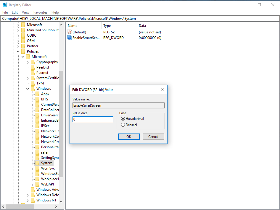 - 더블 클릭 EnableSmartScreen 그 값을 0 (비활성화 됨).