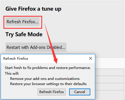 - 팝업 창에서 Firefox 새로 고침 추가 기능, 사용자 지정을 제거하고 브라우저 설정을 기본값으로 복원하여 'Windows에서 PC 보호'가짜 오류 메시지를 제거합니다.