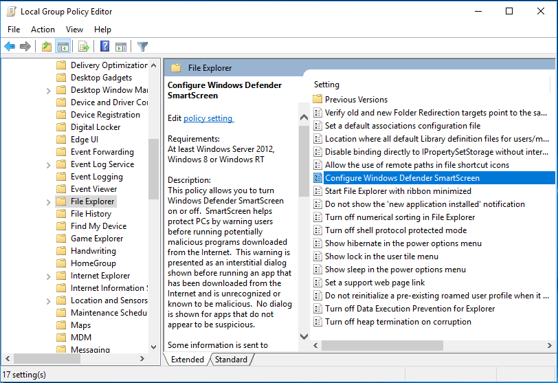 방법 3 : 그룹 정책을 사용하여 SmartScreen 비활성화