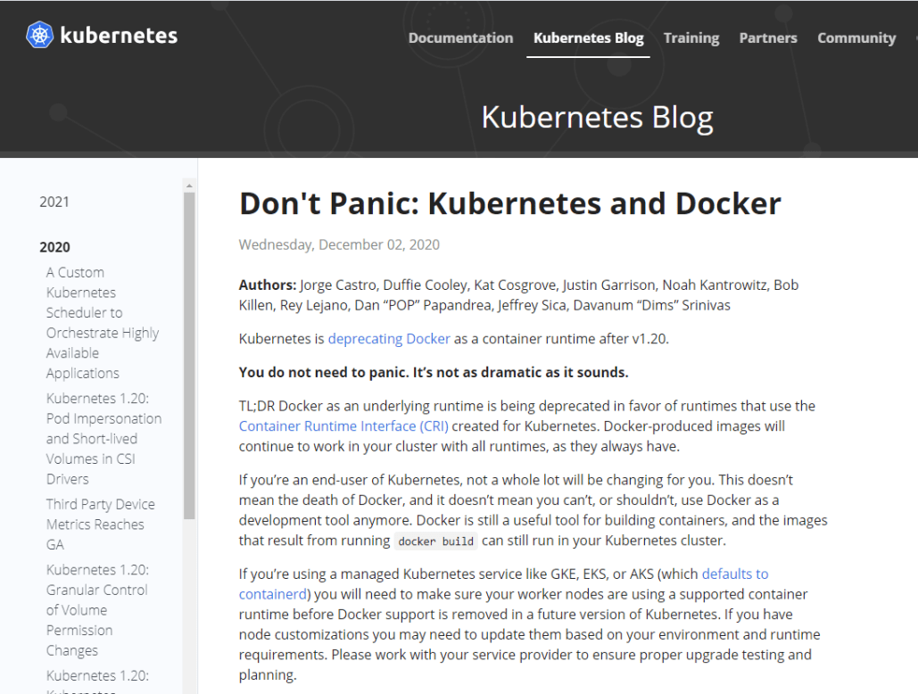 쿠버네티스 는 버전 v1.20 이후 Docker 에 대해 컨테이너 런타임 으로 사용 중지를 알렸습니다.