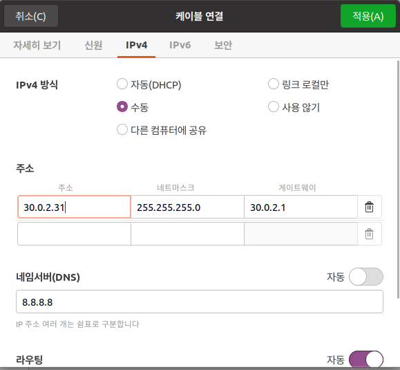 우분투 설정 창에서 다음과 같이 IP 주소를 고정한다. 고정한 후 터미널에서 IP를 확인하면 고정한 것처럼 30.0.2.31이 나오는 것을 확인할 수 있다.