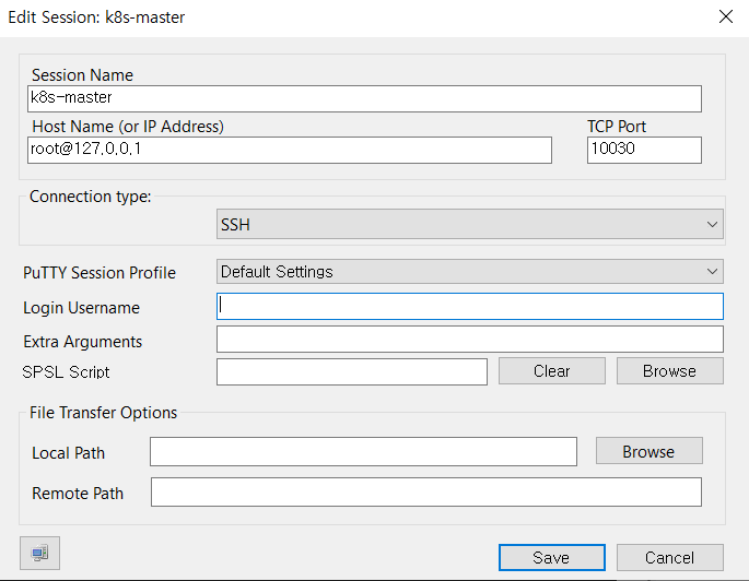 Virtual Box를 이용하는 경우 Host OS에서 복사한 것을 Guest OS에 복사 붙여넣기가 잘 안되는 경우가 많다. 일일이 커맨드 치기가 어렵기 때문에 SuperPutty를 등록한다. 호스트 네임은 우분투 계정@Localhost으로 하면 된다. Port는 Port 포워딩에 설정된 값으로 한다.