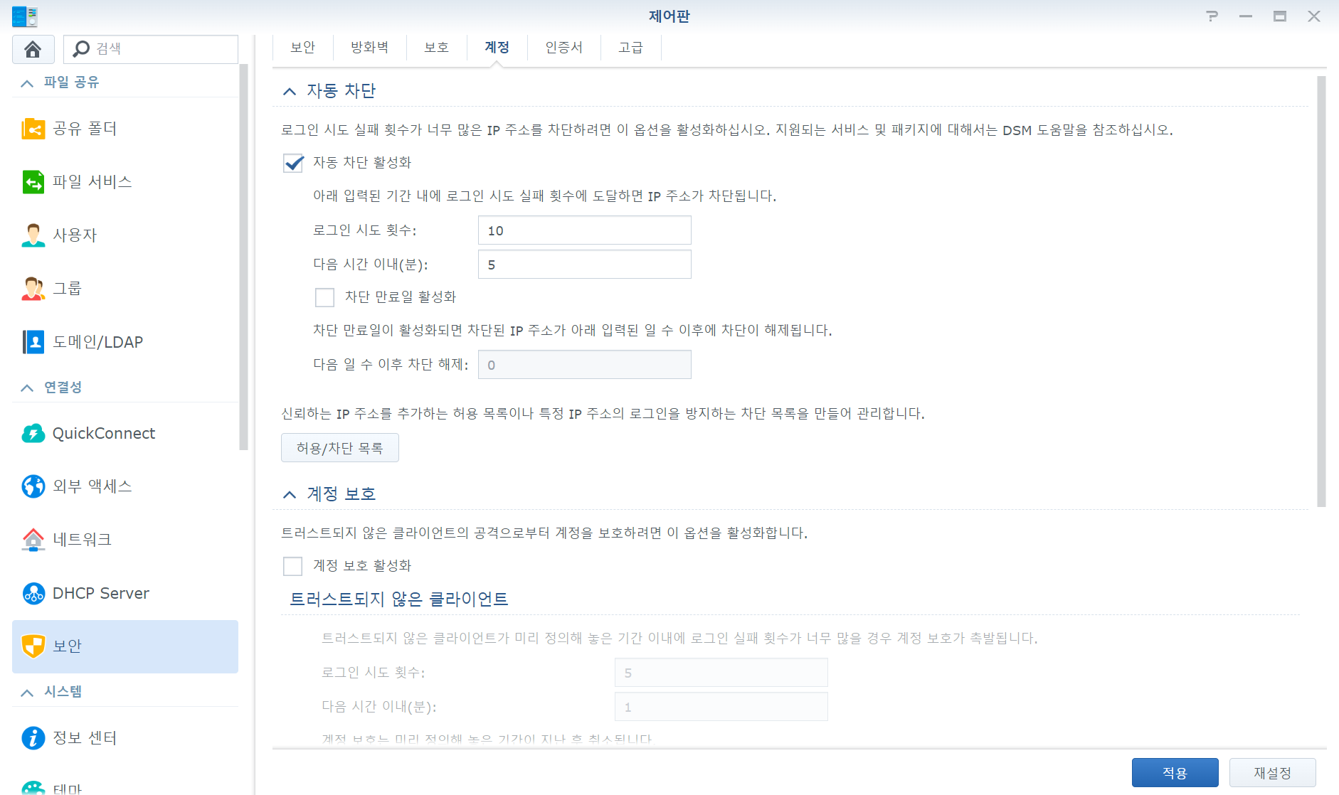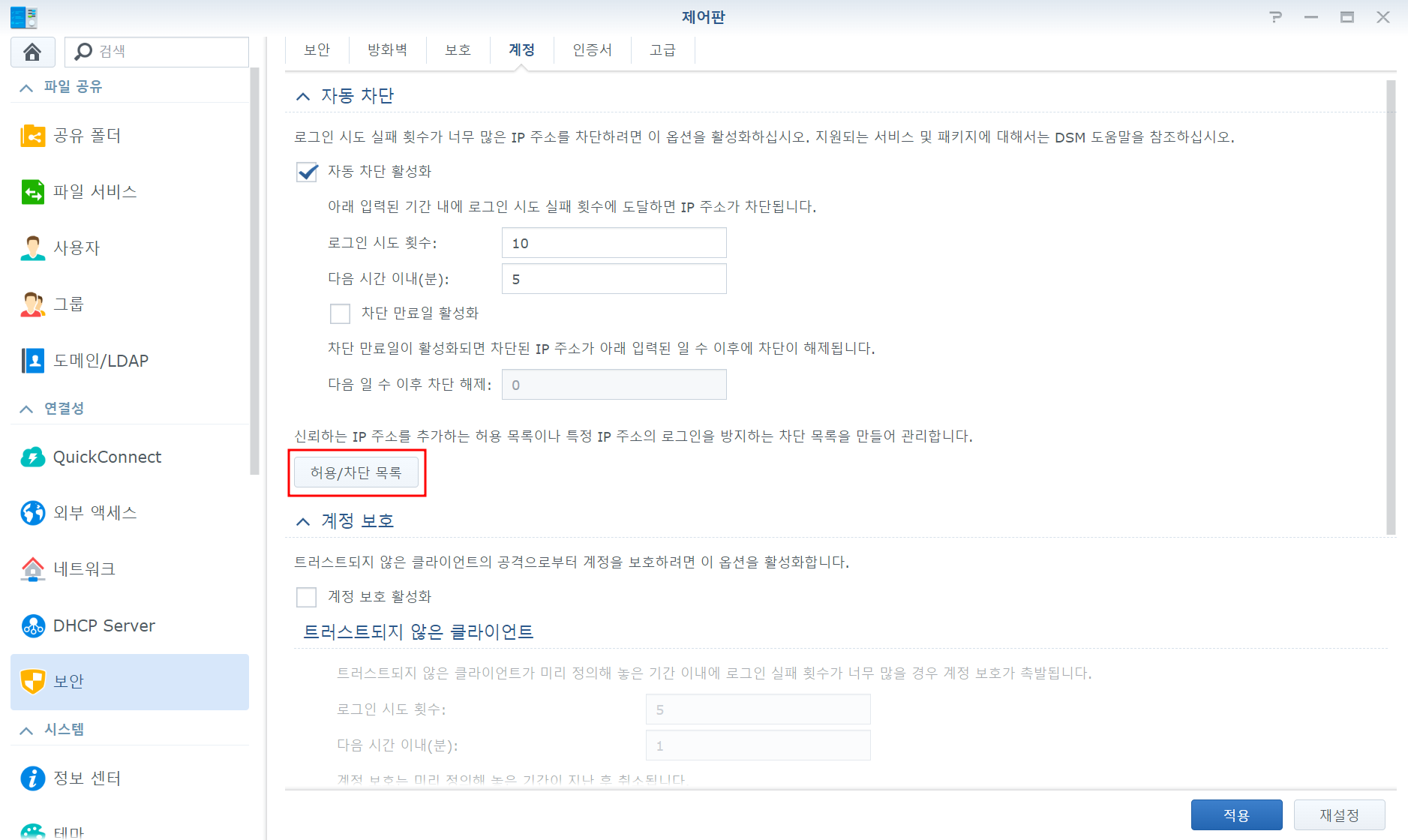 2. 보안 > 계정 > 허용/차단 목록 버튼 클릭