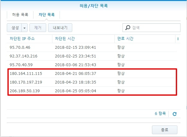 목록에서 차단 해제할 IP를 선택하고 제거 버튼을 누른다.