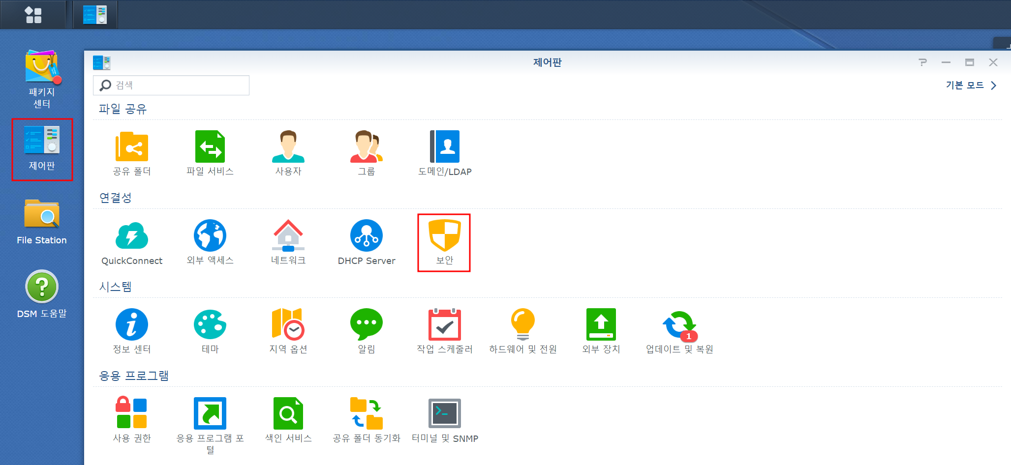 1. Synology NAS 접속 > 제어판 > 보안으로 이동