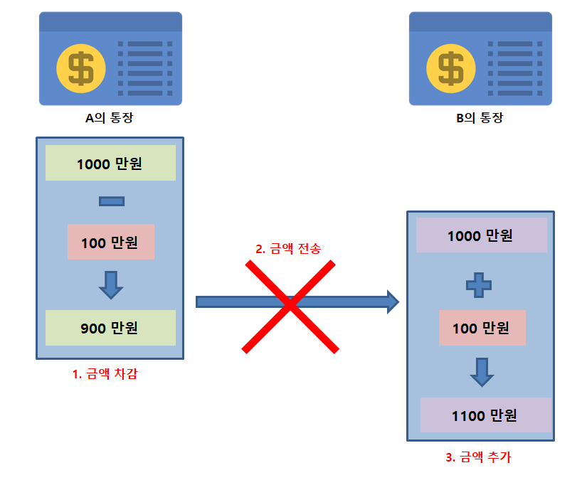 A가 B에게 100만원을 송금해주는 작업을 진행한다면 아래 그림과 같이 "금액차감 -> 금액 전송 -> 금액 추가"