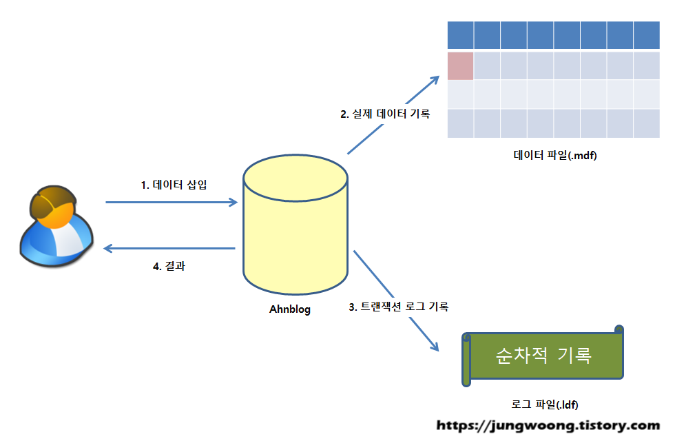 그리고 실제로 데이터가 기록될 때 SQL 서버는 Transaction 로그파일도 순차적으로 기록합니다.