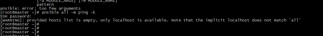 모든 호스트에 ping 체크를 하려는 명령어. 하지만 호스트 리스트에 명령을 내려줄 노드의 정보가 없으니 에러가 뜬다.