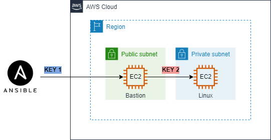 Ansible -> Bastion 으로 SSH 접속할 때와, Bastion -> Private Instance로 SSH 접속할 때 다른 키 페어를 사용할 예정이다.