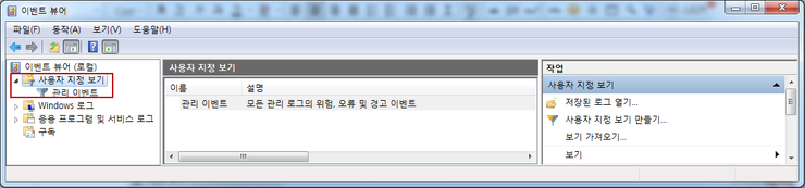 사용자 지정보기에서 시스템에 대해 미리 지정해 둔 이벤트 뷰의 목록이 들어 있으며, 이벤트 로그에 필터를 설정하거나 새로운 이벤트 보기를 만들면 여기에 표시 됩니다.