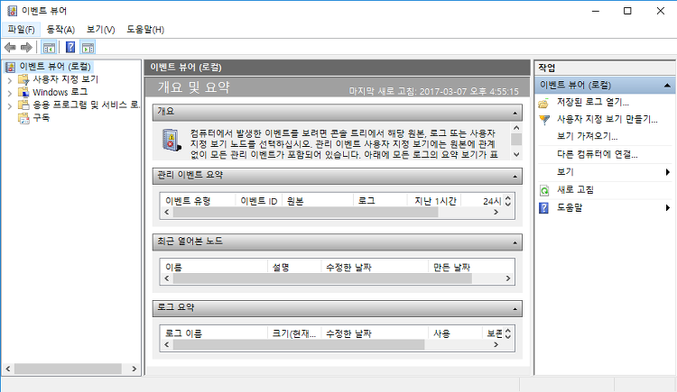 위 그림과 같이 이벤트 뷰어 대화상자가 나타난다 이벤트들의 요약, 최근 본 항목, 할 수 있는 작업등을 볼 수 있습니다.