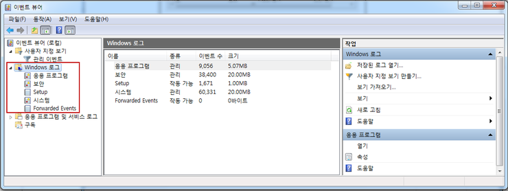 Windows 로그에는 시스템을 감시하는 이벤트는 4가지 항목이 있는데, 응용프로그램 관련 이벤트를 저장하고, 로그온, 사용자 계정, 사용자 권한 등의 시스템 보안 관련 이벤트를 저장하는 [보안], 윈도우 설치관련 이벤트를 저장하는 [Setup], 시스템 서비스와 장치 드라이버 같은 윈도우 구성요소 관련 이벤트를 저장하는 [시스템]이 있습니다.