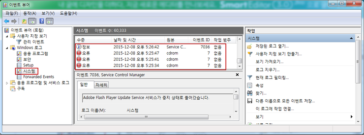 제어판 -> 관리도구 -> 이벤트 뷰어를 클릭합니다.