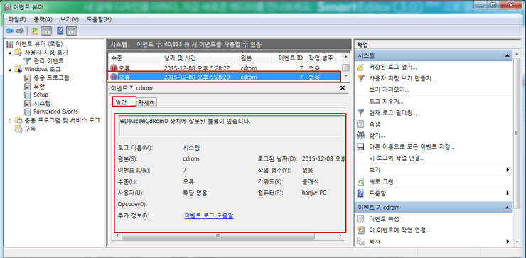 봐야될 로그를 선택하고 가운데 창에서 해당 이벤트의 날짜, 시간, 원본, 이벤트 종류(정보, 경고, 에러)등이 표시가 됩니다.