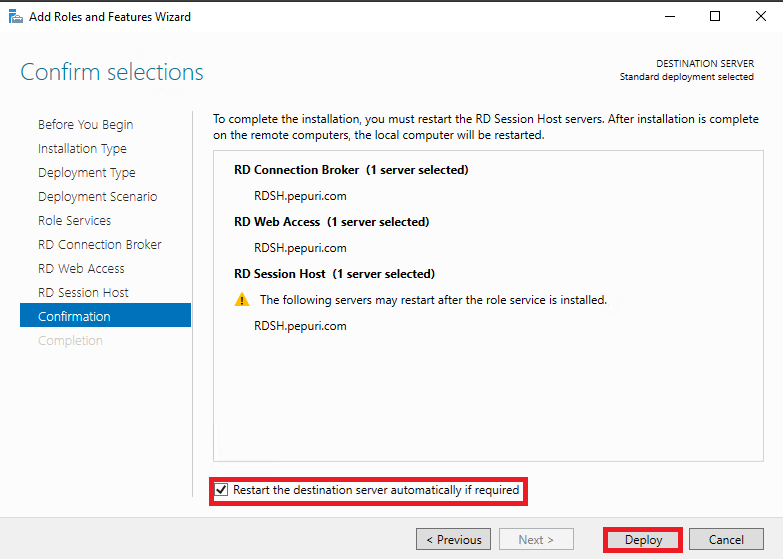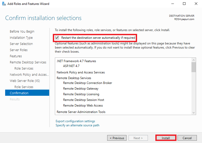 Restart the destination server automatically if required 체크 후 Install
