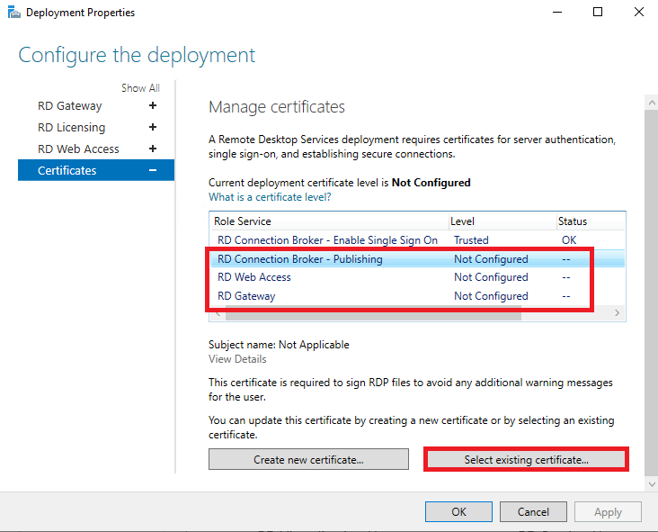 Dashboard - Remote Desktop Services - Overview -TASKS - Edit Deployment Properties
