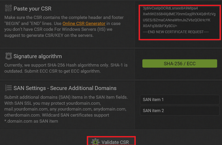 CSR 입력란에 붙여넣기 후 Validate