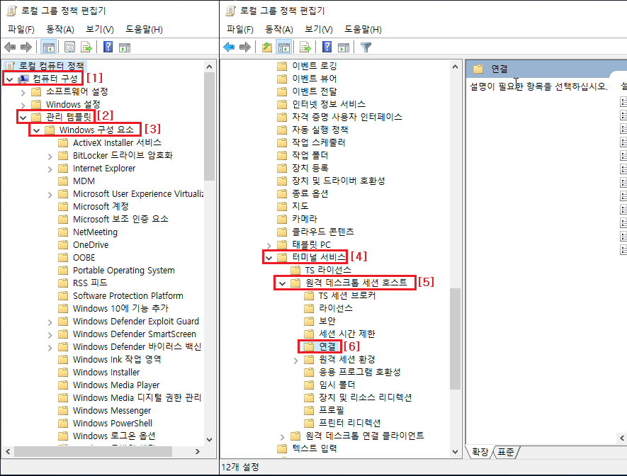 2-2 ①컴퓨터 구성 ▷ ②관리 템플릿 ▷ ③Windows 구성 요소 ▷ ④터미널 서비스 ▷ ⑤원격 데스크톱 세션 호스트 ▶ ⑥연결