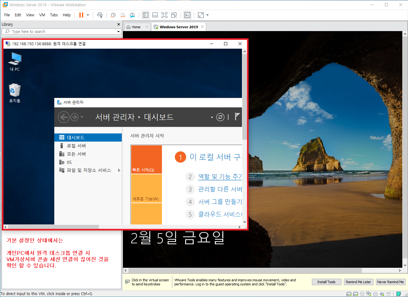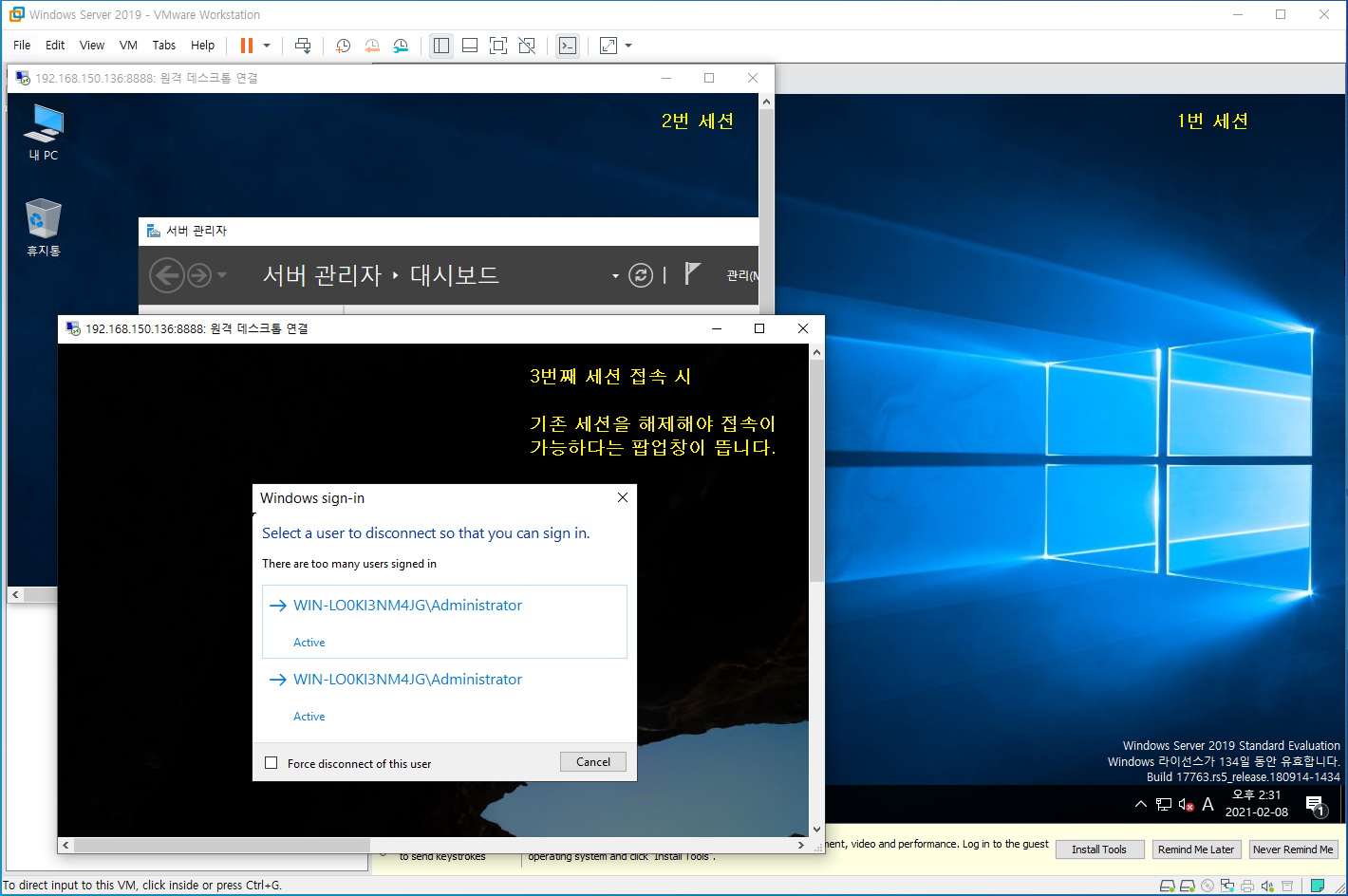 ※ 물리 콘솔이나 가상 VM을 통한 콘솔 로그인도 하나의 세션으로 인식을 합니다. 콘솔 로그인 상태에서 다른 PC에서 원격 데스크톱을 연결하면 콘솔 로그인 세션은 풀리게 됩니다. (스크린샷 참고)