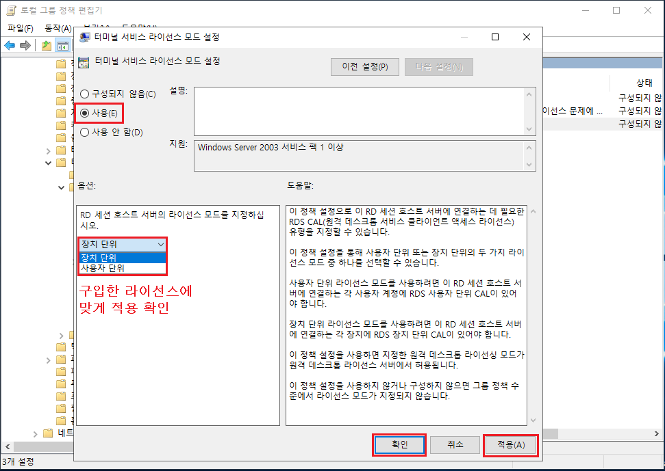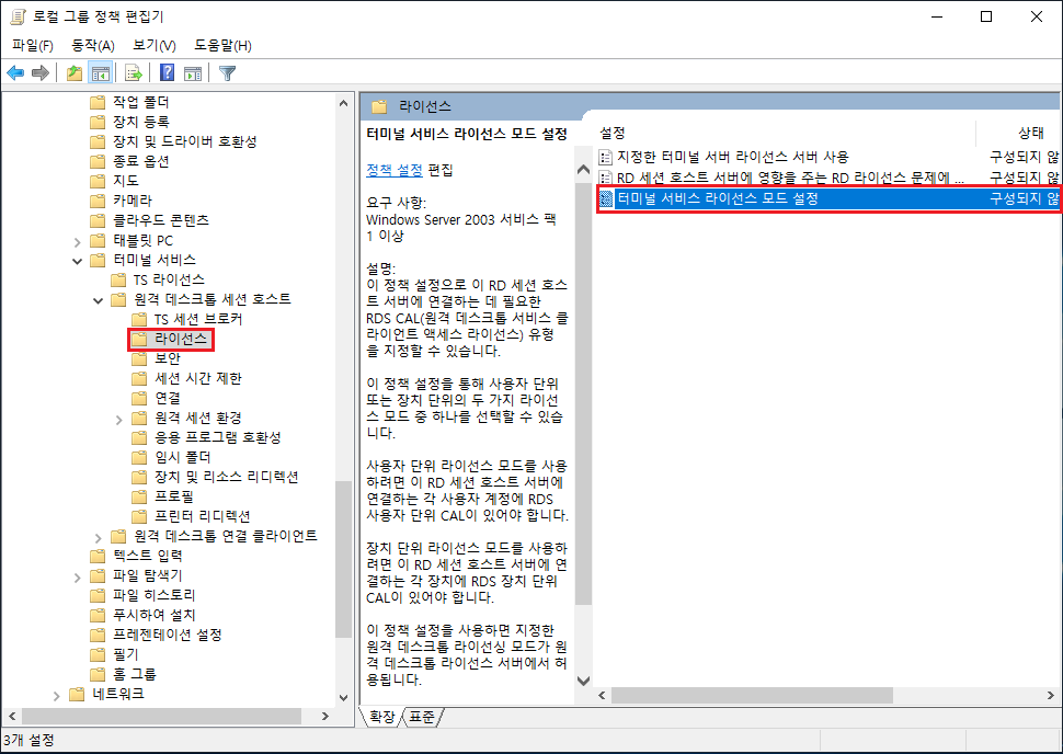 ※ 등록이 완료되면 동일하게 로컬 그룹 정책 편집기에 라이선스 부분에서 [터미널 서비스 라이선스 모드 설정]을 통해
