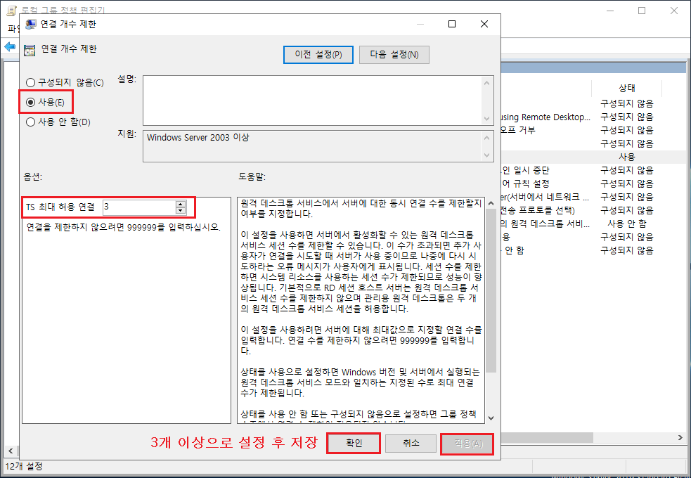※ 하지만 3개부터 접속 시도 시 다른 세션 접속을 끊어야 가능하다는 메시지가 나옵니다. 설정 이름 때문에 많이 오해를 하게 됩니다. 설명을 자세히 읽어보시면 끝에 참고 : 이 설정은 RD 세션 호스트 서버, 즉 원격 데스크톱 세션 호스트 역할 서비스가 설치된 Windows를 실행하는 서버에서 사용됩니다. 다중 접속 할 수 있는 CAL(클라이언트 액세스 라이선스)를 구입을 해야 사용할 수 옵션입니다.