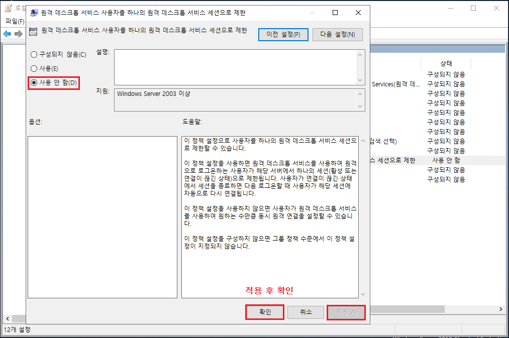 2-3 원격 데스크톱 서비스 사용자를 하나의 원격 데스크톱 서비스 세션으로 제한 ▶ 사용 안 함 적용
