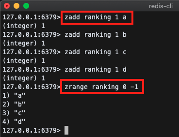 - zrange 명령어를 통해서 출력 범위를 지정할 수 있습니다. (-1 이면 뒤에서 부터 시작)