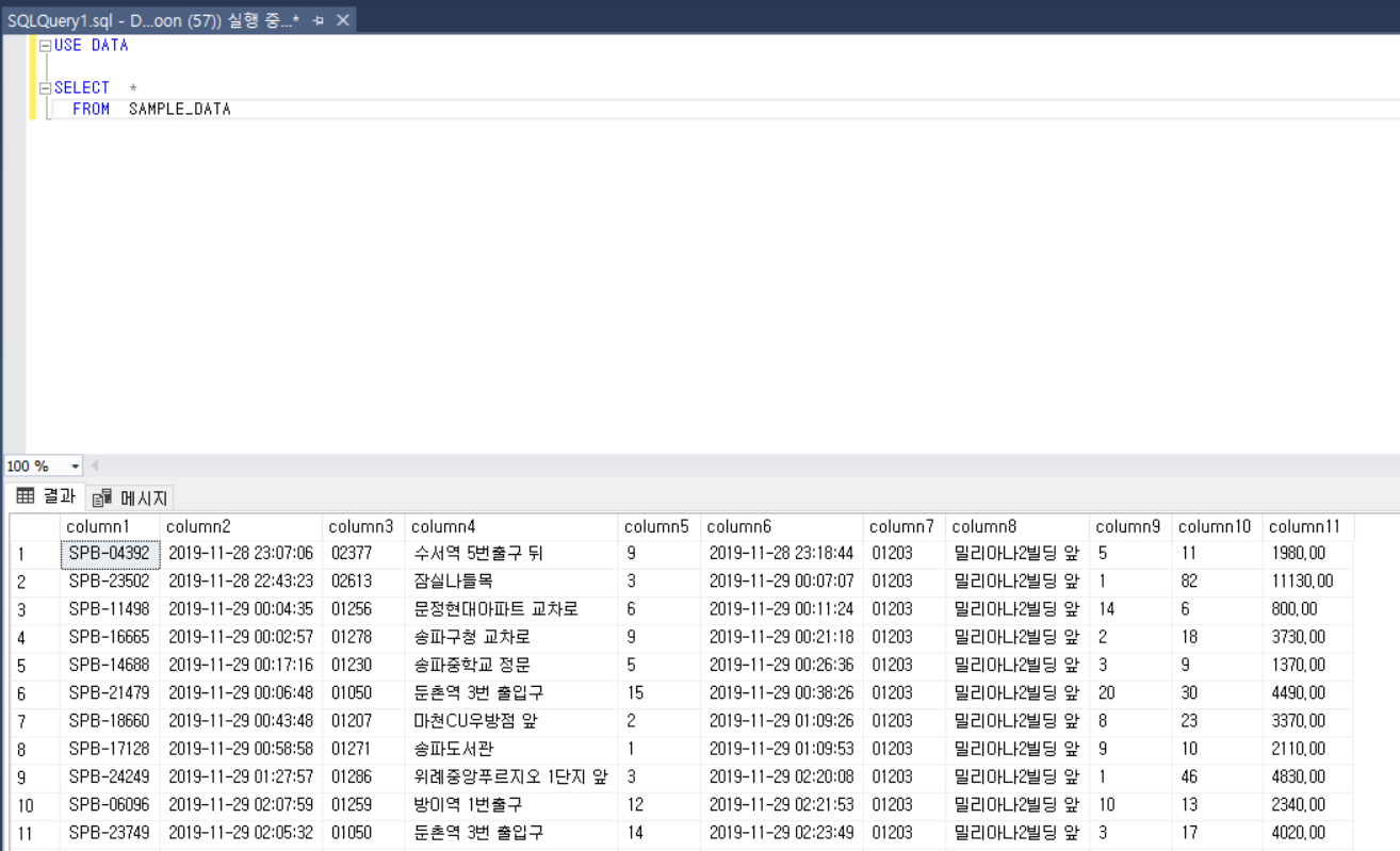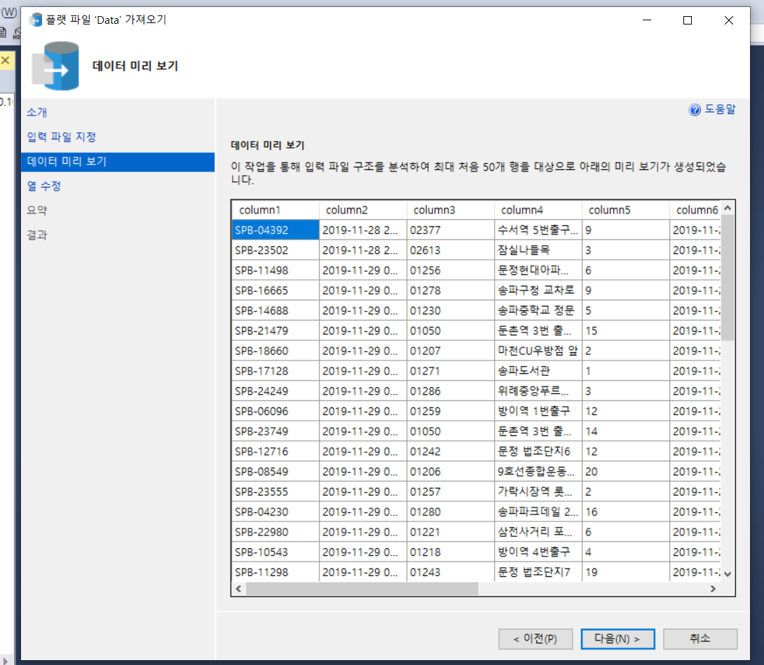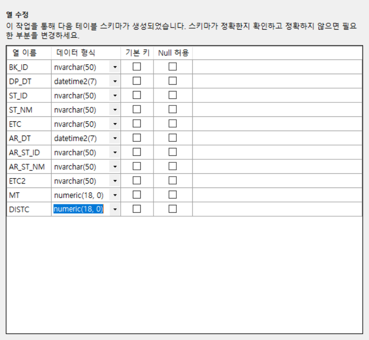 14. 날짜면 DATETIME, 문자열이면 NVARCHAR 등 컬럼 속성에 맞게 지정해주어야 하지만 오늘은 그냥 열 속성을 변경하지 않고 입력해보겠습니다. + 수정) 각각의 데이터 특성에 맞게 컬럼명과 형식을 지정해줍니다.