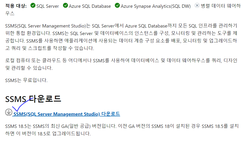 3. 이후 사용조건 수락, 다운로드가 완료되면 아래처럼 SSMS를 설치할 수 있는 링크로 연결할 수 있습니다.