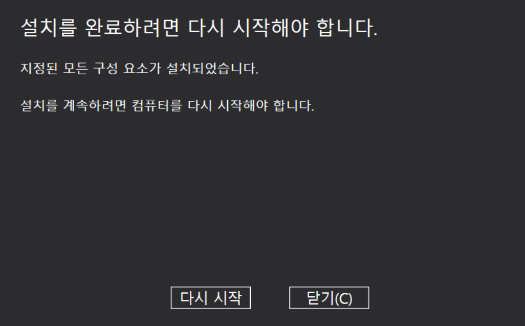 5. 아마도 SSMS 설치를 완료하려면 컴퓨터를 다시 시작해야합니다. 저희는 이어서 데이터를 입력해볼 것이니 바로 그 자리에서 재부팅을 해줍니다.